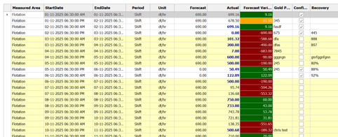 The updated Actual Production value will now appear in bold in the grid, indicating it has been modified from the original entry.